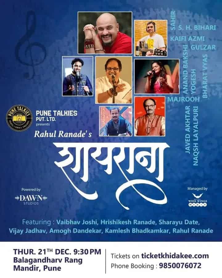 Live Shows The VirtuososShayranaShankar MahadevanRaRa rum pumMaifil Shabd SuranchiK FactorCinema Navacha ManusAsha BhosaleShayranaThe MastersMemoirs of Madan MohanFilms AstitvaZing Chik ZingVaastavTiche Shahar HoneSumbaranKaaksparshParadhDr. Prakash Baba AmteKaccha LimbuHathyarTheatre ZundVaccum CleanerNandiMounaragHimalayachi SavaliHamletGalibDhol TasheBajirao Mast MiKahani Mein Twist Special Projects Click here to listen Click here to listen Cick here to listen